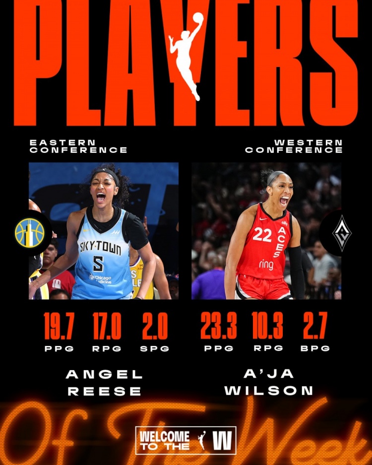 7月2日讯 今日,WNBA官方宣布,芝加哥天空内线安吉尔-里斯和拉斯维加斯王牌内线阿贾-威尔逊当选第6周东西部最佳球员。